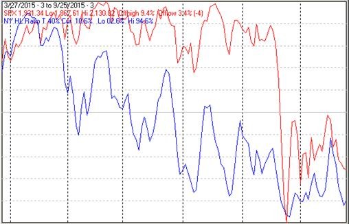 The first chart shows the S&P500 (SPX) in red and a 40% trend (4 day EMA) of NYSE new highs divided by new highs + new lows (NY HL Ratio), in blue. Dashed vertical lines have been drawn on the 1st trading day of each month. Dashed horizontal lines have been drawn at 10% levels for the indicator, the line is solid at the 50%, neutral level.