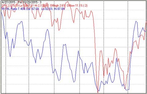 The next chart is similar to the one above except it shows the NASDAQ composite (OTC) in blue and OTC HL Ratio, in red, has been calculated from NASDAQ data.