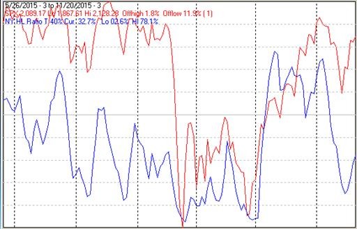 The chart below covers the past 6 months showing the S&P 500 (SPX) in red and a 40% trend (4 day EMA) of NYSE new highs divided by new highs + new lows (NY HL Ratio), in blue. Dashed vertical lines have been drawn on the 1st trading day of each month. Dashed horizontal lines have been drawn at 10% levels for the indicator, the line is solid at the 50%, neutral level.