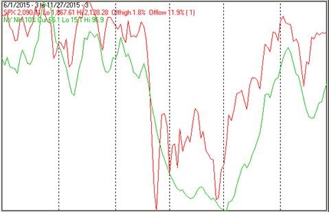 The next chart covers the past 6 months showing the SPX in red and a 40% trend (4 day EMA) of NYSE new highs divided by new highs + new lows (NY HL Ratio), in blue.  Dashed horizontal lines have been drawn at 10% levels for the indicator, the line is solid at the 50%, neutral level.