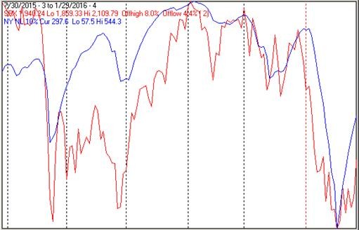The next chart covers the past 6 months showing the SPX in red and a 40% trend (4 day EMA) of NYSE new highs divided by new highs + new lows (NY HL Ratio), in blue. Dashed horizontal lines have been drawn at 10% levels for the indicator, the line is solid at the 50%, neutral level.