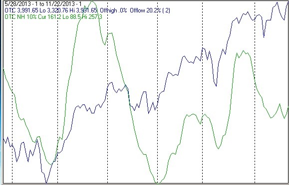 The next chart is similar to the one above except is shows the S&P500 (SPX) in red and NY NH, in green, has been calculated from NYSE data.