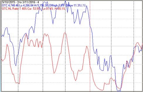 The first chart covers the past 6 months showing the NASDAQ composite (OTC) in blue and a 40% trend (4 day EMA) of NASDAQ new highs divided by new highs + new lows (OTC HL Ratio), in red. Dashed vertical lines have been drawn on the 1st trading day of each month. Dashed horizontal lines have been drawn at 10% levels for the indicator, the line is solid at the 50%, neutral level.