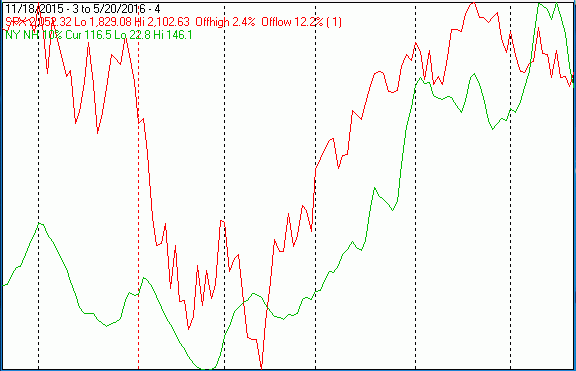 The chart below is similar to the one above except it shows the SPX in red and NY HL Ratio, in blue, has been calculated from NYSE data.