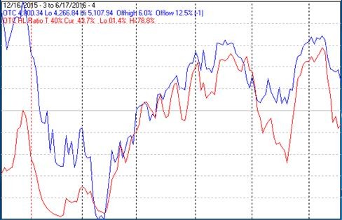 The first chart covers the past 6 months showing the NASDAQ composite (OTC) in blue and a 40% trend (4 day EMA) of NASDAQ new highs divided by new highs + new lows (OTC HL Ratio), in red. Dashed vertical lines have been drawn on the 1st trading day of each month. Dashed horizontal lines have been drawn at 10% levels for the indicator, the line is solid at the 50%, neutral level.