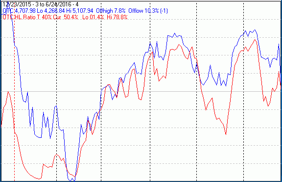 The first chart covers the past 6 months showing the NASDAQ composite (OTC) in blue and a 40% trend (4 day EMA) of NASDAQ new highs divided by new highs + new lows (OTC HL Ratio), in red. Dashed vertical lines have been drawn on the 1st trading day of each month. Dashed horizontal lines have been drawn at 10% levels for the indicator, the line is solid at the 50%, neutral level.