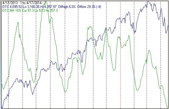 The chart below covers the past year showing the NASDAQ composite (OTC) in blue and a 10% trend (19 day EMA) of NASDAQ new highs (OTC NH) in green. Dashed vertical lines have been drawn on the 1st trading day of each month.