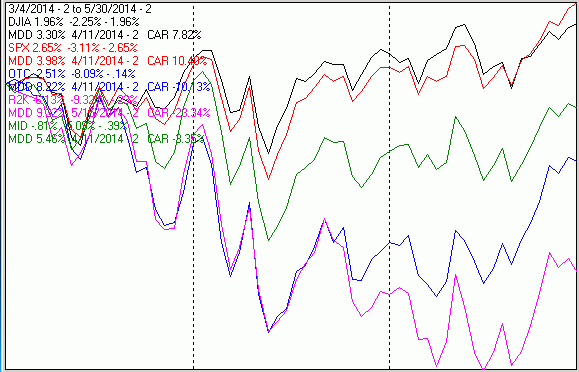 The chart below covers the period from March 4 when the Russell 2000 (R2K) hit its all time high and the OTC hit a multi year high. It shows the major indices on log scales to illustrate the stratification in performance. Dashed vertical lines have been drawn on the 1st trading day of each week and the 1st trading day of each month.