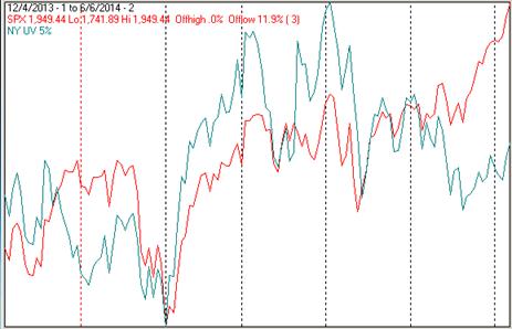 The chart below covers the past 6 months showing the SPX in red and a 5% trend (39 day EMA) of NYSE upside volume (NY UV), in green. Dashed vertical lines have been drawn on the 1st trading day of each month.