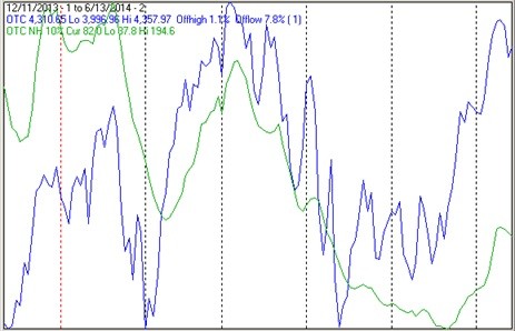The next chart is similar to the one above except it shows the OTC in blue and OTC HL Ratio, in red, has been calculated from NASDAQ data.