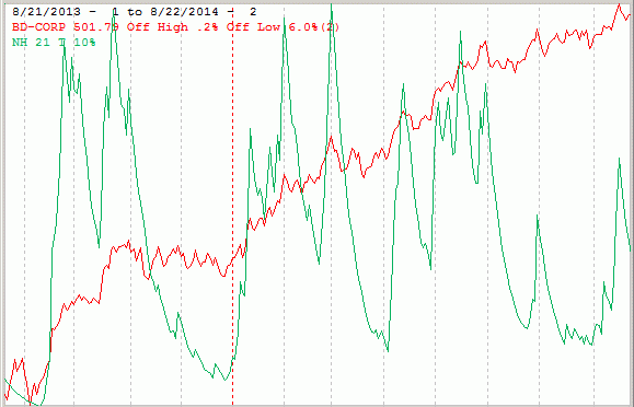 There are 185 funds in the FastTrack database specializing in junk (high yield) bonds. The chart below is similar to the one above except it shows an average of the junk bond funds in red and new highs in green were calculated from the junk bond fund list.