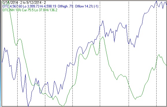 The chart below covers the past 6 months showing the NASDAQ composite (OTC) in blue and a 10% trend (19 day EMA) of NASDAQ new highs (OTC NH) in green. Dashed vertical lines have been drawn on the 1st trading day of the month.