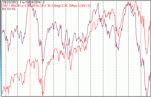 The next chart is similar to the one above except is shows the NASDAQ composite (OTC) in blue and OTC DV has been calculated from NASDAQ data.
