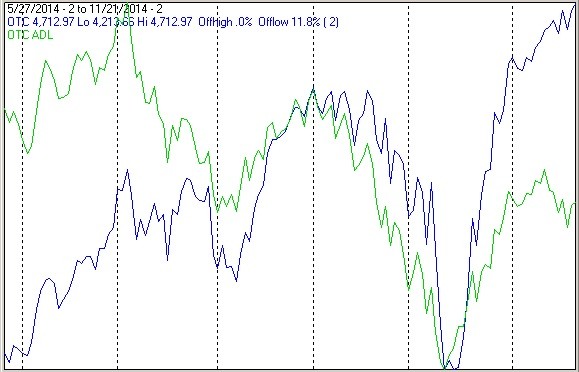 The chart below covers the past 6 months showing the NASDAQ composite (OTC) in blue and an ADL calculated from NASDAQ issues (OTC ADL) in green. Dashed vertical lines have been drawn on the 1st trading day of each month.