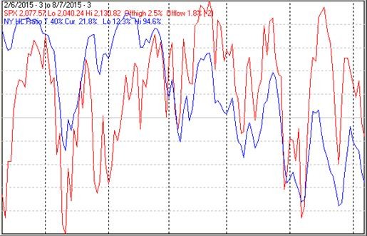 The first chart covers the past 6 months showing the S&P 500 (SPX) in red and a 40% trend (4 day EMA) of NYSE new highs divided by new highs + new lows (NY HL Ratio), in blue. Dashed vertical lines have been drawn on the 1st trading day of each month. Dashed horizontal lines have been drawn at 10% levels for the indicator, the line is solid at the 50%, neutral level.