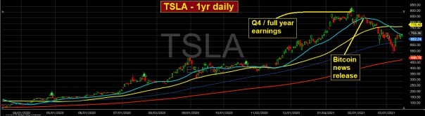 In an attempt to arrest the sell-off in TSLA since its post-SPX inclusion all-time high of $833 on January 26th, Musk released the 2020 20-K early on Monday, February 8th, in which it was announced that TSLA had bought $1.5 billion worth Bitcoin with shareholder money. The move by Musk was designed to deflect attention away from his unwillingness to “hard code” sales guidance for 2021 – something for which historically he always issued bold, specific numbers. He was hoping to offset the stock’s price decline after the earnings release on January 27th and wanted to get the Roman Candle stock price launch experienced by Microstrategy when its CEO announced a plan to load up on Bitcoin.
