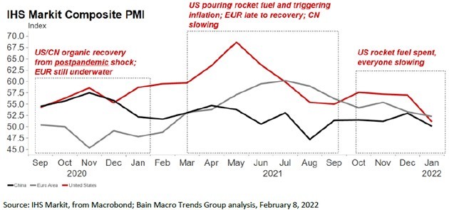“In the third act, all three players seem to be aligning around shared choreography—a shuffle to a slower pace. Last week’s IHS Markit composite PMI data (for the month of January 2022) indicates the US, Chinese, and European economies are in their closest proximity to each other since January 2020.”