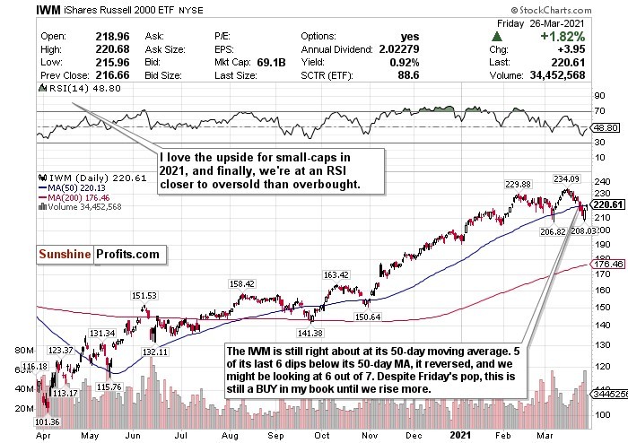 Fast forward to Tuesday (Mar. 23). The Russell 2000 saw its worst day since February 25, dropped below its 50-day, and I switched the call to a BUY.