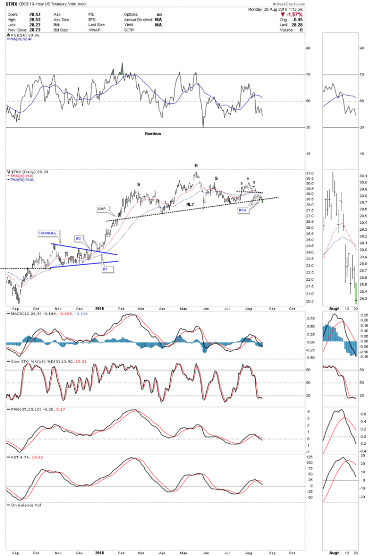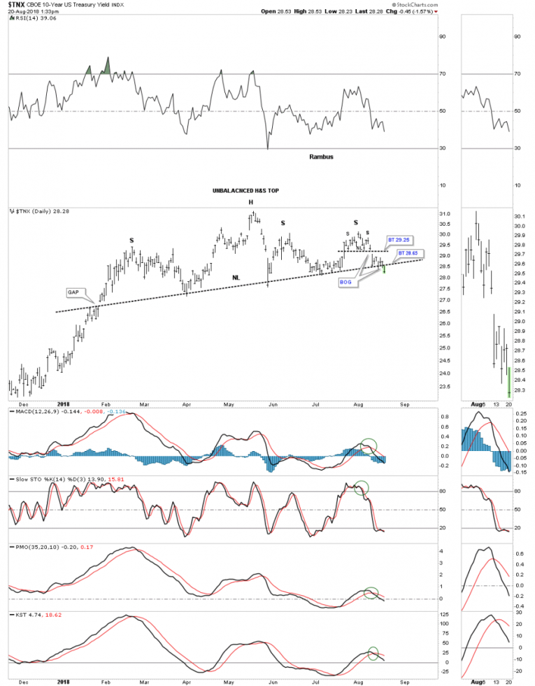 Over the last several months or so I’ve been writing about the bond market throwing us a possible curveball. Instead of continuing rising interest rate we may see falling rates. Today the $TNX, 10 year treasury yield finally broke below the neckline we’ve been following that started to developing back in January of this year. I’ve labeled the H&S top as an unbalanced H&S top as the price action formed a second right shoulder that was a small H&S top. A backtest to the neckline would now come into play around the 28.65 area.