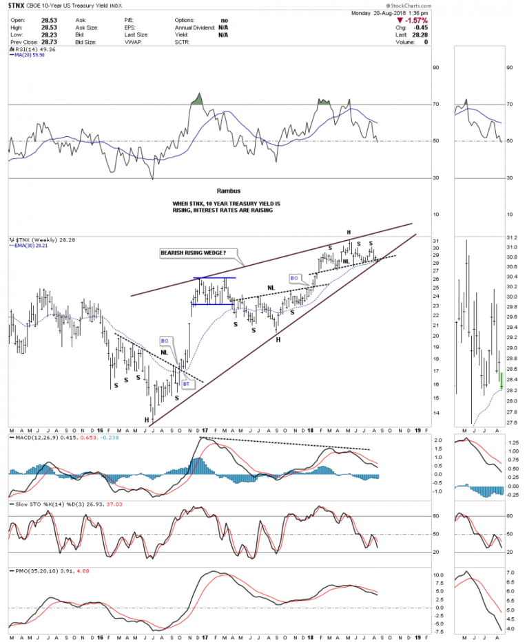 The weekly chart shows the $TNX has been rising for the last two years building out a possible bearish rising wedge with the H&S top forming at the top. That H&S top is strongly suggesting the bottom rail of the black rising wedge is going to give way to the downside. The curveball has almost reached home plate.