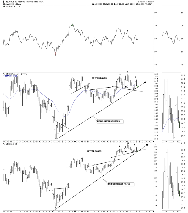 Below is a combo chart which has the $TYX, 30 year bond on top and the $TNX 10 year bond on the bottom.