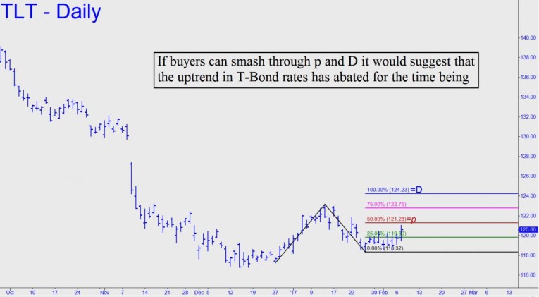 TLT is within a day’s rally of an important resistance, a midpoint Hidden Pivot at 121.28 (see above) that is associated with a target at 124.23. If that last number were to be achieved, it would correspond to a drop in T-Bond rates to 2.83% from a current 3.02%. It is what happens after that that’s important, however, since the target is compelling enough that we should expect a tradable pullback from it.