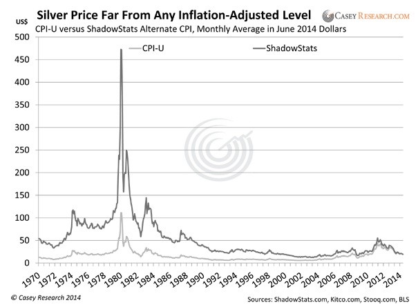 One hint of silver’s potential is its inflation-adjusted price. I asked John Williams of Shadow Stats to calculate the silver price in June 2014 dollars (July data is not yet available).