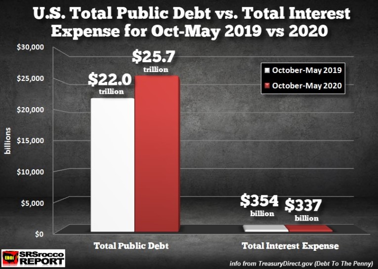According to TreasuryDirect.gov, the U.S. public debt increased from $22.8 trillion to $25.7 trillion during fiscal 2020 (October to May). Thus, total U.S. federal debt has increased by nearly $3 trillion in eight months compared to $1.2 trillion last year… for the entire year!! So, with $3 trillion more debt on the U.S. Government’s balance sheet, you would think the interest expense would have also increased.