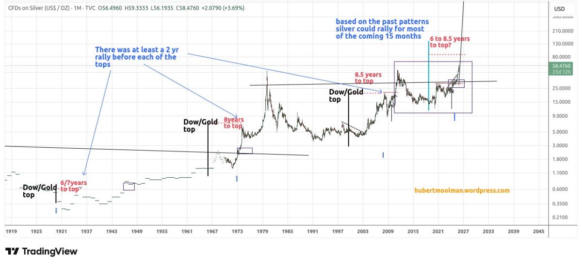 In a previous article I have shown how significant silver peaks occurred within 8.5 years after the Dow/gold ratio peak, with the Great Depression silver peak occurring the soonest (6 to 7 years after). Here is an updated chart of that post: