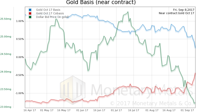 Here is the gold graph (Oct contract), this time showing intraday resolution for the full week (here is the live gold basis chart).