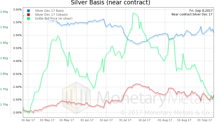 This is the October contract, which is under selling pressure (pushing down basis and up cobasis). However, there has been a significant drop in the dollar (the mirror image of how most people think of it, a rising gold price). Here is the continuous gold basis chart for comparison. There is not much change in continuous cobasis, as price rises (and as you can see above, a rise in October cobasis).