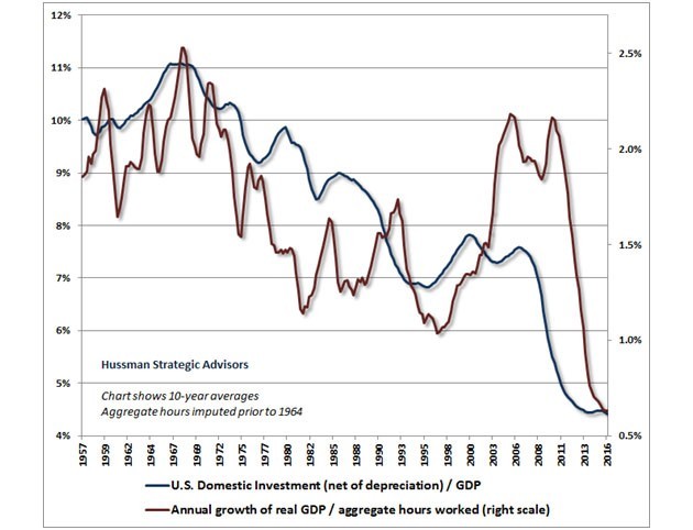 Economic growth is not a mystery. As Dr. John Hussman reminds us, economic growth always comes down to the sum of just two things: 1) more people working, 2) higher productivity. Add them up and you get the real growth rate. Everything else means nothing unless it contributes to these two factors.