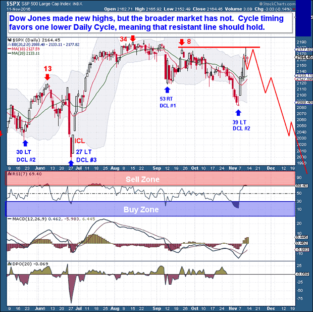 The Dow Jones made a new high this week, but the broader market has yet to follow. And since weekly Cycle timing continues to favor more downside before an Investor Cycle Low (ICL), the resistance line on the below chart should continue to hold. At this point, there is not enough evidence to warrant speculating about a new Investor Cycle (IC) and IC rally.