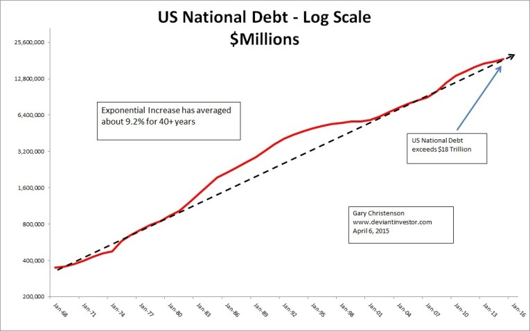 Examine the following log-scale graph of US official debt. Debt is growing at 9% per year while the economy limps along at 1% or 2% (depending on dodgy inflation estimates and who is counting) and is not sustainable.