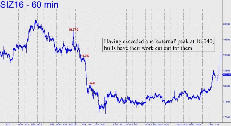 The futures did everything we’d asked of them and more, generating a fresh bullish impulse leg on the hourly chart in the process. The next bullish benchmark lies at 18.940, equal to an ‘external’ peak recorded October 3 on the way down. The futures will need to exceed that number on the next thrust to re-energize the intraday charts.