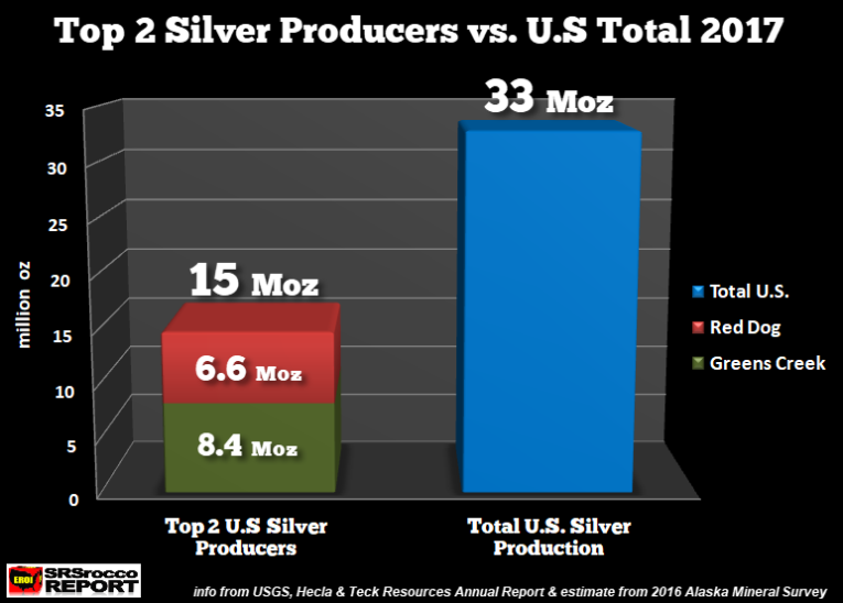 The USGS just came out with their final Silver Mineral Industry Survey for 2017, reporting that the U.S. produced 33 million oz (Moz), down from 37 Moz the previous year. U.S. silver production declined due to the union strike and the shut down of Hecla’s Lucky Friday Mine. As we can see, Greens Creek and Red Dog accounted for 15 Moz of the total 33 Moz of U.S. silver production: