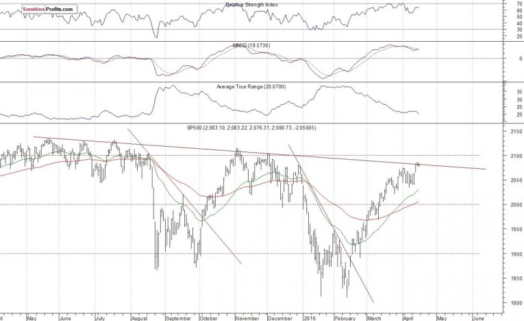 The U.S. stock market indexes lost 0.1-0.3% on Friday, extending their short-term uncertainty as investors awaited quarterly corporate earnings, economic data releases. The S&P 500 index continues to trade close to its last year's local highs. The nearest important level of resistance is at around 2,100-2,120. On the other hand, support level is at 2,030-2,040, marked by recent consolidation, and the next level of support is at 2,000-2,020, marked by previous level of resistance. The index continues to trade within a descending medium-term trading channel. There have been no confirmed short-term negative signals so far. However, we still can see overbought conditions: