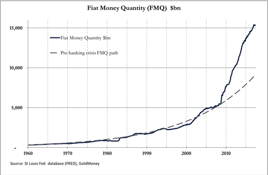 Since the last financial crisis, there has been a massive expansion in the quantities of most currencies. The following chart shows the expansion of fiat dollars since 2009, which has been far greater than the rate of increase prior to the financial crisis, shown by the dotted line.