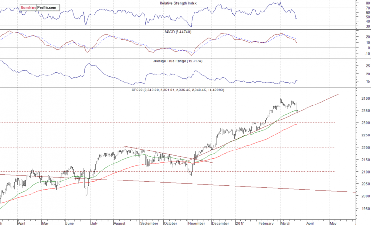 The U.S. stock market indexes were mixed between 0.0% and +0.7% on Wednesday, as investors hesitated following Tuesday's relatively big move down. Traders took profits off the table after last week's interest rates increase, among others. The S&P 500 index remained more than 2% below its March 1 all-time high of 2,400.98. The Dow Jones Industrial Average continued to trade below 20,700 mark, and the technology Nasdaq Composite index bounced by 0.5%, as it broke above the level of 5,800 again. Overall, stocks continued to trade below their almost month-long consolidation along new record highs. Is this just correction or a new downtrend? For now, it looks like a downward correction within medium-term uptrend. The nearest important level of support of the S&P 500 index is at around 2,335-2,340, marked by some previous local lows. The next support level remains at 2,320, marked by February 13 daily gap up of 2,319.23-2,321.42, among others. The support level is also at around 2,300, marked by December - January local highs. On the other hand, the nearest important level of resistance is now at around 2,350-2,360, marked previous level of support. The next resistance level is at 2,390-2,400, marked by all-time high. We can see some short-term volatility following four-month-long rally off last year's November low at around 2,100. Is this a topping pattern before downward reversal? The uptrend accelerated on March 1 and it looked like a blow-off top pattern accompanied by some buying frenzy. The S&P 500 index trades at its five-month-long upward trend line, as we can see on the daily chart: