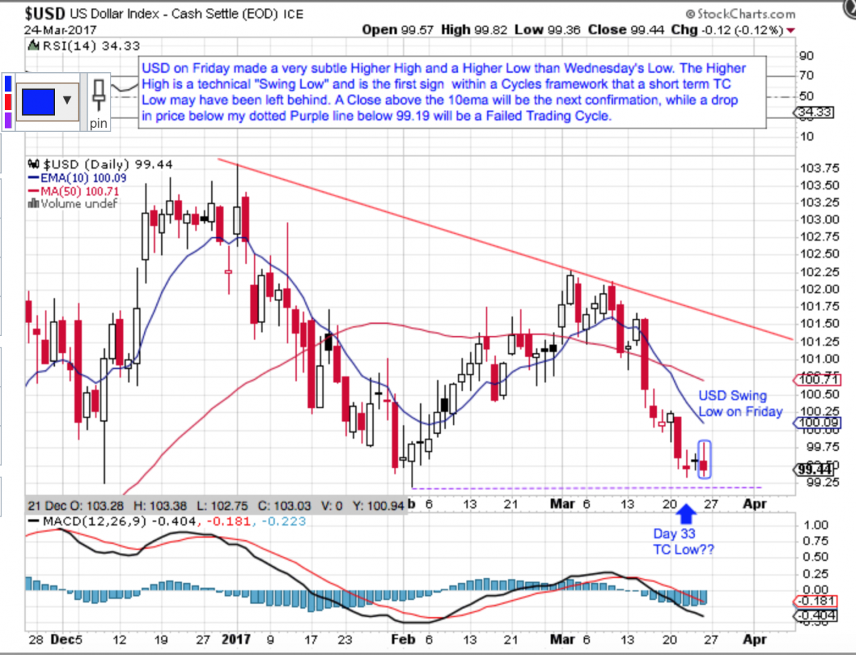 Chart 3 is a nine month chart with the same Blue line. Note that we a within a whisker of a Failed Trading Cycle here but the USD is also showing signs of bottoming or basing just short of making a Lower Low here. My last chart shows the last several months of price action - and why next week will be critical, IMO. It clearly shows the USD is at a short-term inflection point. Either it is forming a double bottom from where it will bounce next week or it will break down and have a failed Trading Cycle. Based on Time, I would expect it to make a decision rather soon as we are either on day 35 or on day 2 of a new Trading Cycle should Wednesday’s low on Day 33 prove to be a Trading Cycle Low.