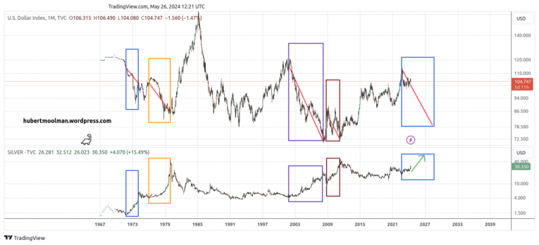 Notice how the DXY broke down at the double blue line, close to a multi-year silver rally in 1977 and 2003. It is likely setting up another one of those breakdowns, which will be a great signal for the silver bull market. Note that the silver chart has a few interesting related patterns.