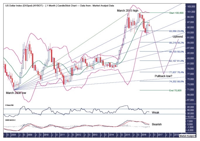 I have drawn a Fibonacci Fan from the 2001 high to 2008 low. Price has recently been flirting above the 76.4% angle but I believe this a false dawn and price is set to break below and then get smashed down to the 61.8% angle to set up the higher low.