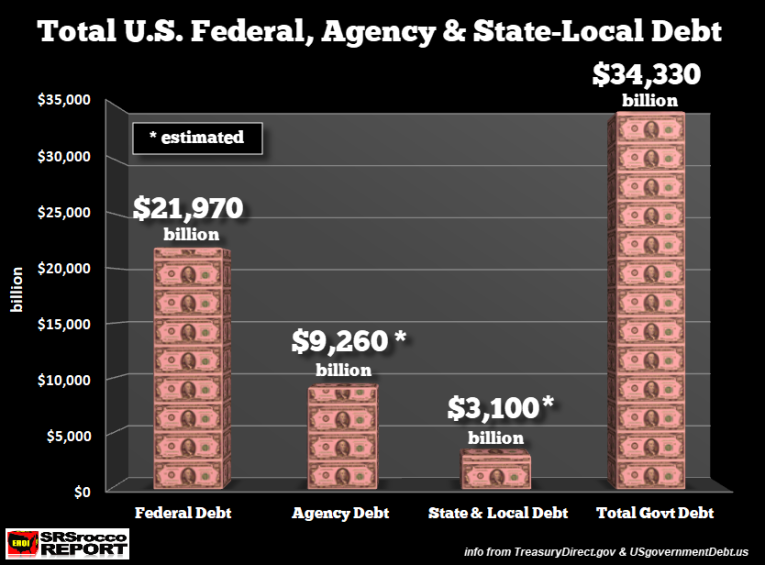 Okay, let’s start adding up all the U.S. Government debt and put it into perspective. The total U.S. Federal debt is $21.97 trillion while U.S. Agency debt comes in at a whopping $9.26 trillion and State-Local Debt is $3.1 trillion: