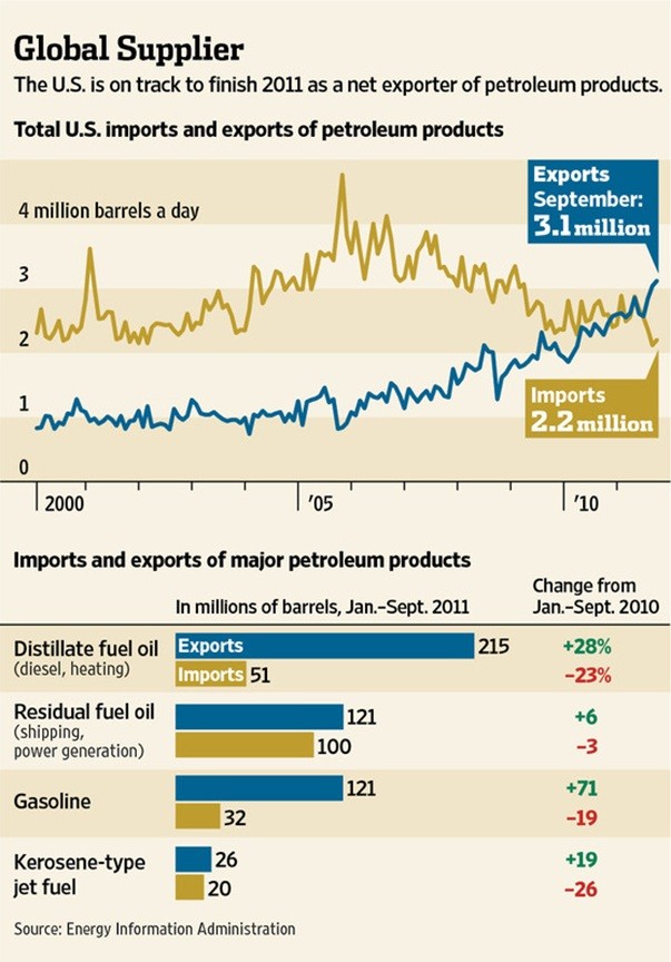 Today, in typically Machiavellian fashion; the U.S. government and its media parrots boast that the U.S. is now a “net energy exporter”. It’s still importing lots of oil. However; U.S. demand for petroleum products has collapsed to such an extent that U.S. refineries now export so much of their output that it exceeds oil imports.