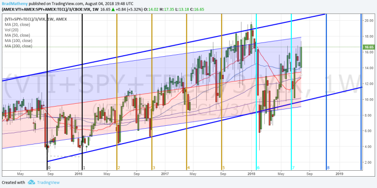 This Weekly Custom Market Cap Volatility Index shows the same date range as the previous Daily chart.  We should be able to see the Blue channel levels that originate much earlier as normal price channel ranges.  We have added a Std. Deviation channel to this chart originating from the 2010 lows that show the range as associated by the deviation ranges.