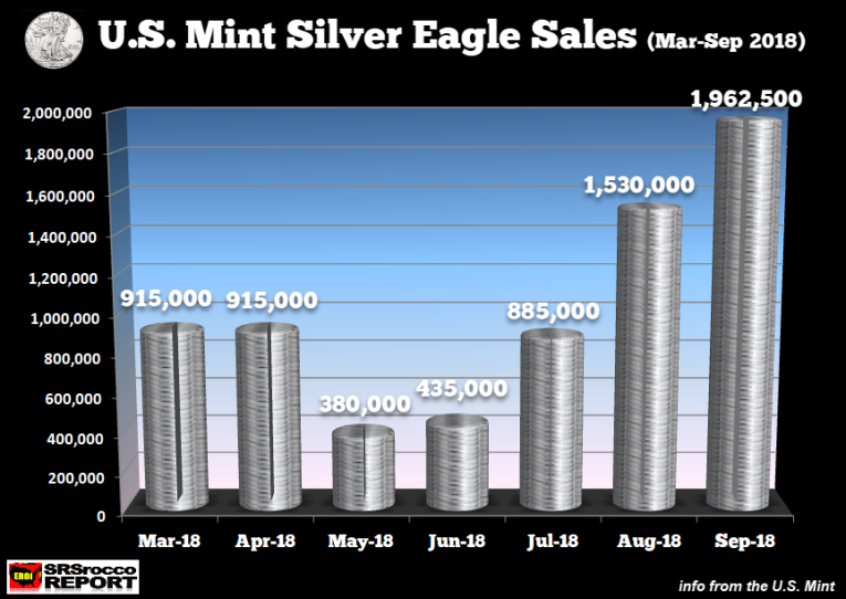 Demand for the U.S. Mint Silver Eagles spiked again at the end of the September pushing sales nearly to three million. In a little more than a week, Silver Eagle sales jumped from 1.9 million to 2.9 million, nearly doubling from the previous month. Sales of Silver Eagles in August were only 1.5 million versus 2.9 million in September.