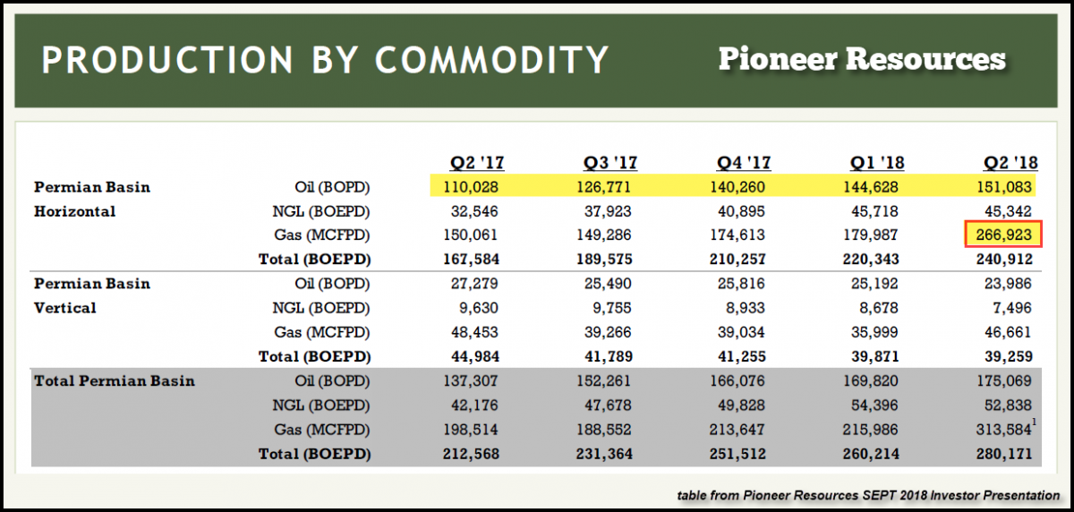 You will notice that Pioneer’s shale oil production increased significantly in Q3 & Q4 2017 versus Q1 & Q2 2018. Furthermore, Pioneer’s shale gas production surged in Q2 2018 by nearly 50% (highlighted with a red box) compared to oil production only increasing 5%. That is a serious RED FLAG for natural gas production to jump that much in one quarter.