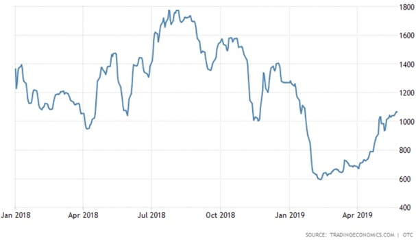 We can also use the BDI to analyze the trade war. The index rose to a 2018 high last September, but it dropped sharply, over 50%, in the first two months of the year (to the lowest in two years) due to declining demand for commodities particularly China, the world’s largest commodities consumer.