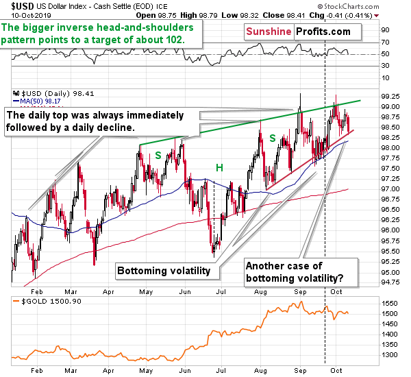 The double support that was reached: the early October low and the rising red support line based on the August lows is likely to trigger a reversal, just as it did in September. Please note that, just as it was the case in September, the USD Index might move below the red line temporarily (perhaps to the 50-day moving average at about 98.15 or so) before rallying. Such a move would not invalidate the bullish setup at all.