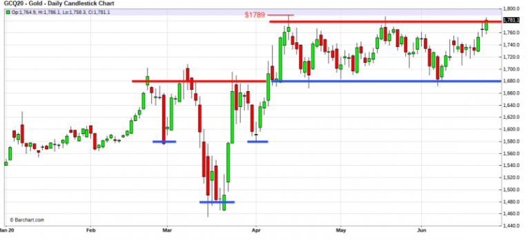 For now, though, while price has rallied strongly since June 5, it's still within the same range that has contained it since mid-April—roughly bounded by $1680 on the low end and $1780 on the high end. What we await is a breakout above this range and a daily close above the April 14 intraday high of $1789.